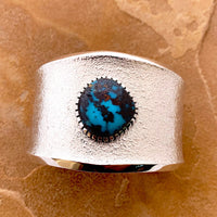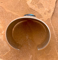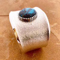 Navajo Ric Charlie Sterling Silver Tufa Cast Cuff Bracelet set with all natural Chinese turquoise stone. It is 1-3/4" across the surface and tapers to 1-1/8" at the ends. It has a 1" opening and the a 2" height. The width is 2-7/16" on the interior of cuff. It is 5-3/8" women's small size.