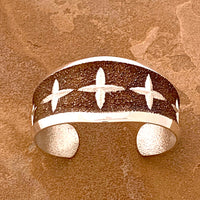Navajo Ric Charlie tufa cast cuff STARS bracelet. It is a women's small 5-1/8" from end to end. It is 1-3/16" width across the top and tapers to 5/8" at the ends. It has a 1" opening. On the interior: 2-3/16" width and 1-5/8" from base to top.