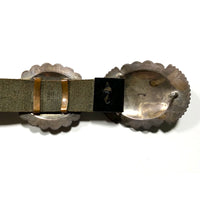 Vintage Concho belt with nice original patina. There are 10 domed conchos plus one buckle, with heavy, intricate stamp work and a Sleeping Beauty turquoise cabochon in each concho. Belt length 33 in., concho, height 2 in. x width 2 1/4 in., belt buckle 2 in. x 2 5/8 in. Sterling silver.